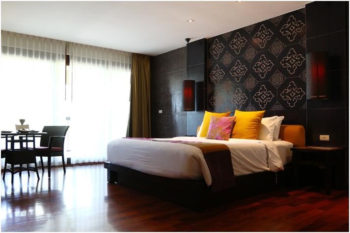 之前介紹了Sareeraya的設施,地理位置和周邊環境, (Sareeraya環境篇)現在要來看看75平方米的大房間到底是長怎樣啦!當初六千多台幣的房型有兩種選擇,開門可以之接通往泳池的"Sareeraya Suite Jaccuzzi Pool Access" 還有 "Sareeraya Suite Jaccuzzi Sea View" 兩種房型的有按摩浴缸,一個是開門直接通往泳池,一個是面海.想了想之後覺得別人可能可以經由泳池跑到房間,又無法抗拒早上起來可以看到無敵海景的誘惑,就選擇了第二種房型. (不論哪種房型都是可以加床的喔!)Check in 完成後服務人員會幫忙把行李送進房間,會有專人帶我們到房間介紹並介紹相關設施還有電器的使用以及一些必需用品的擺放位置.深色的木地板和床頭的牆面乍看之下覺得房間顏色很重.但是白色的天花板和彩色的抱枕及整片的落地窗帶進的光線又讓房間明亮寬闊了起來.很典型的泰國風情裝潢.